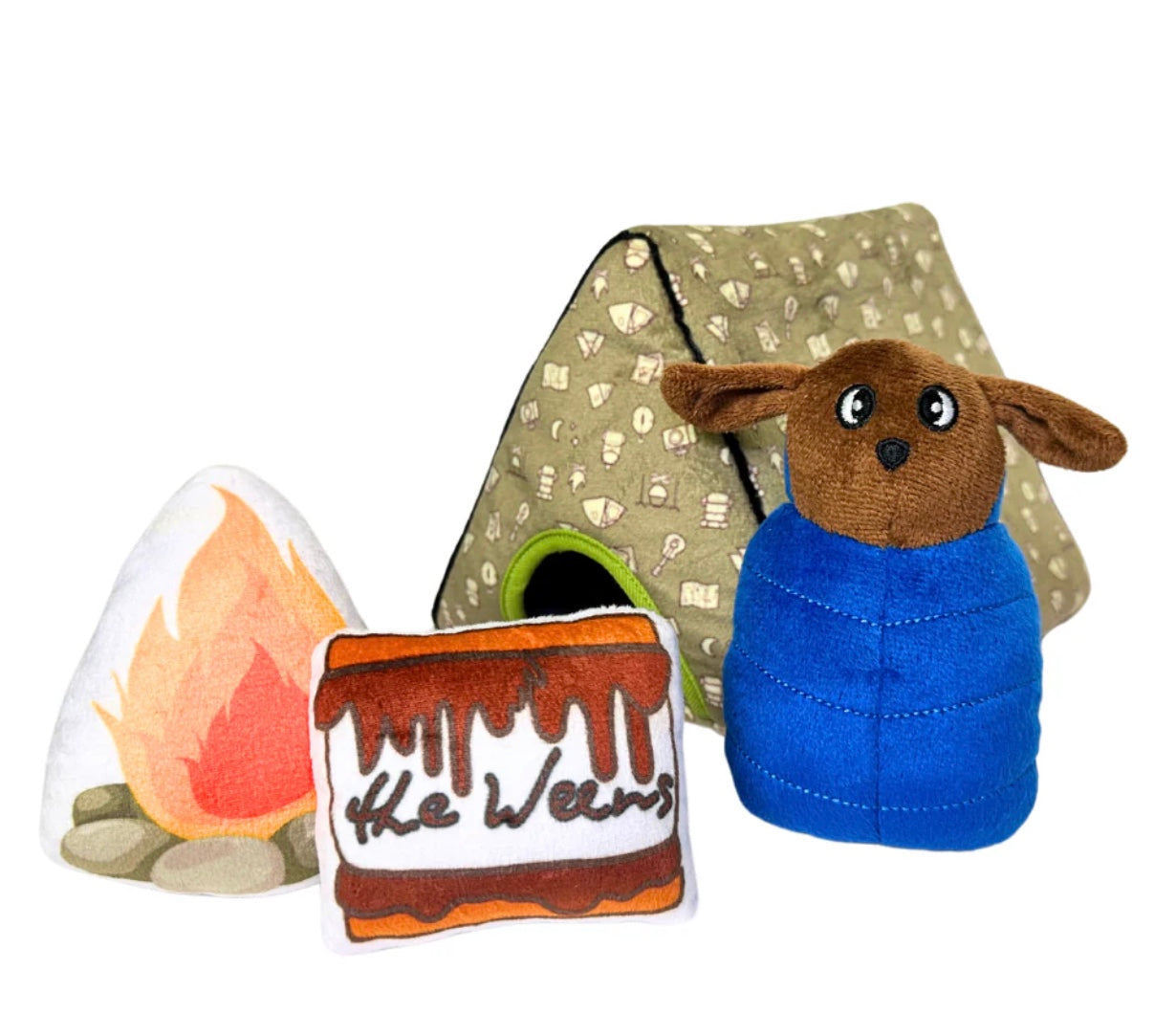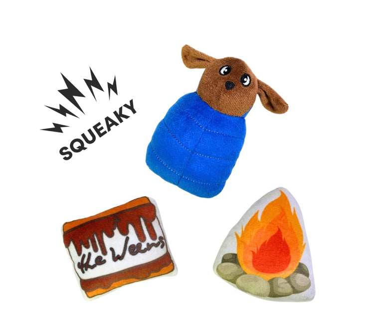 This set includes 3 squeaky plush toys—a doggo in a sleeping bag, a campfire, and a s'more—along with a plush pouch.