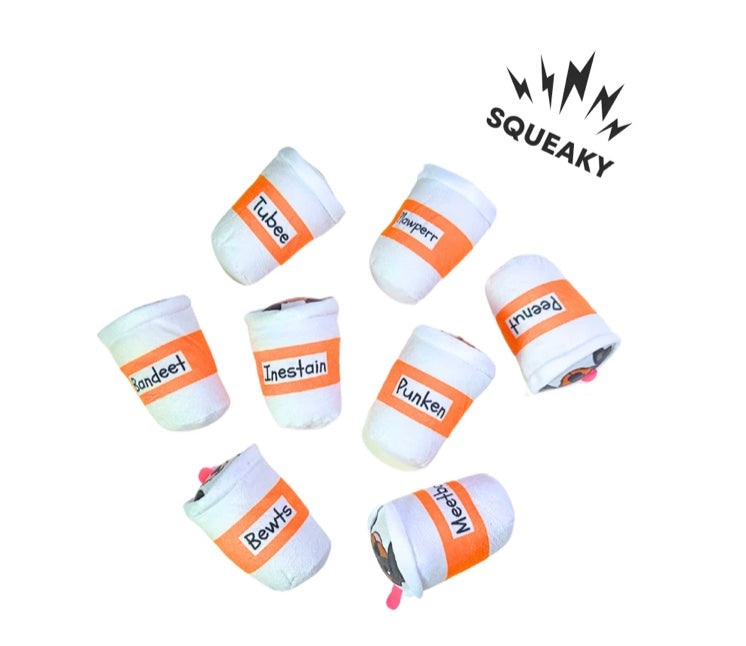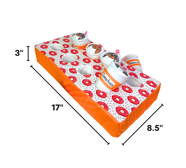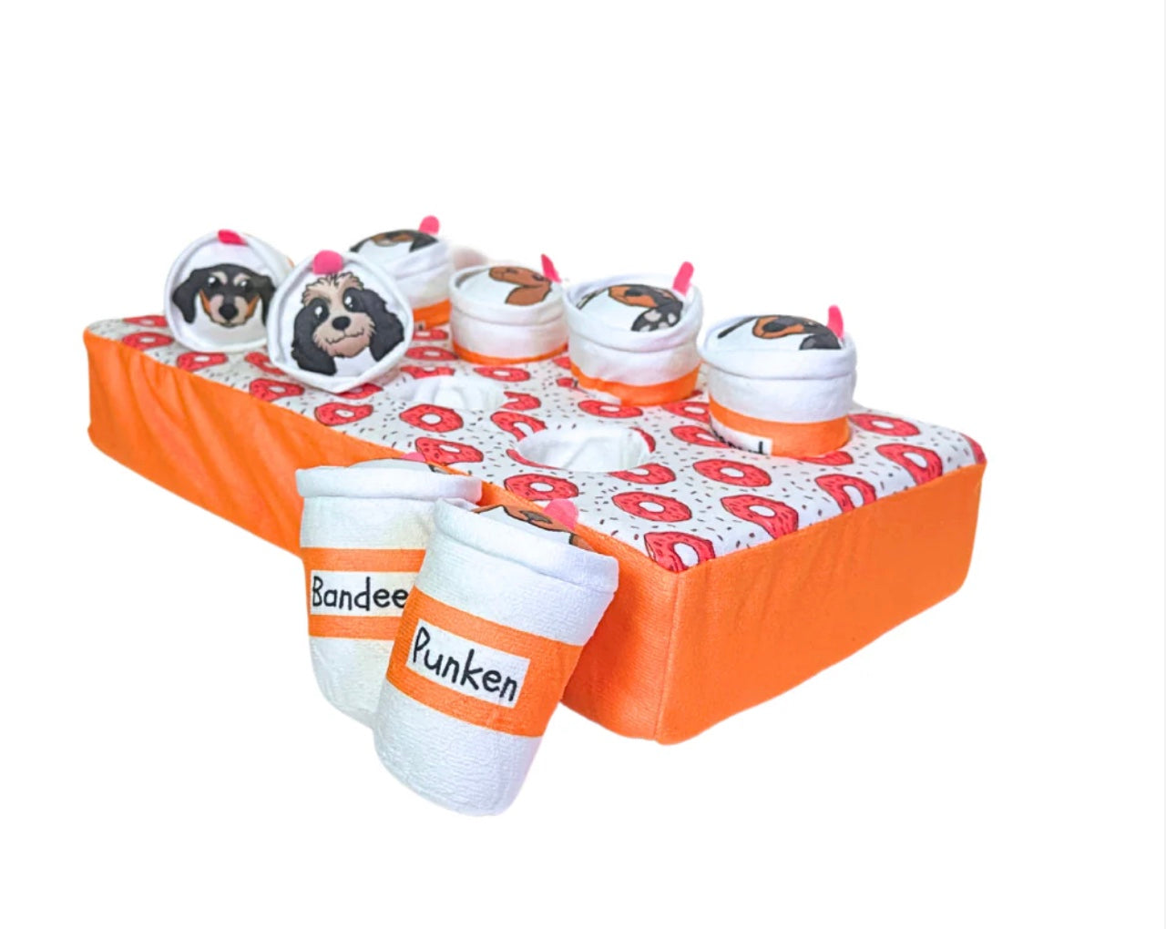 Too Much Caffween is an interactive dog toy featuring a memory foam base and 8 squeaky plush toys, each with unique illustrations and nicknames of the Weens.